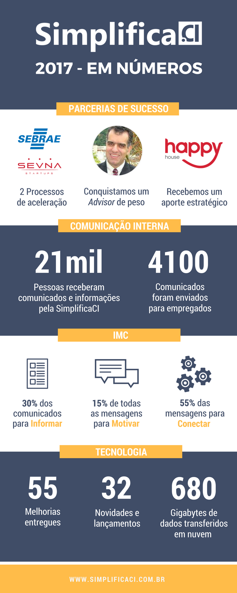 Em 2017 a SimplificaCI acelerou em todos os sentidos. Com a confiança de nossos clientes aprendemos, na prática, as dificuldades e oportunidades na Comunicação Interna nas empresas. A partir da experiência de nossa equipe, as orientações de nosso Advisor e os dois processos de aceleração, desenvolvemos soluções para simplificar o dia-a-dia dos profissionais. Nossa missão é criar possibilidades para que a área de Comunicação Interna assuma cada vez mais seu papel estratégico na companhia.